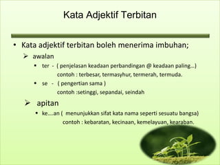 Perkataan dalam bahasa Melayu mengandungi berbagai-bagai bentuk yang dapat. Kata adjektif terbitan adalah kata adjektif yang menerima imbuhan awalan sisipan akhiran dan apitan Kata adjektif ganda terbahagi kepada dua iaitu kata ganda penuh di mana dilakukan.